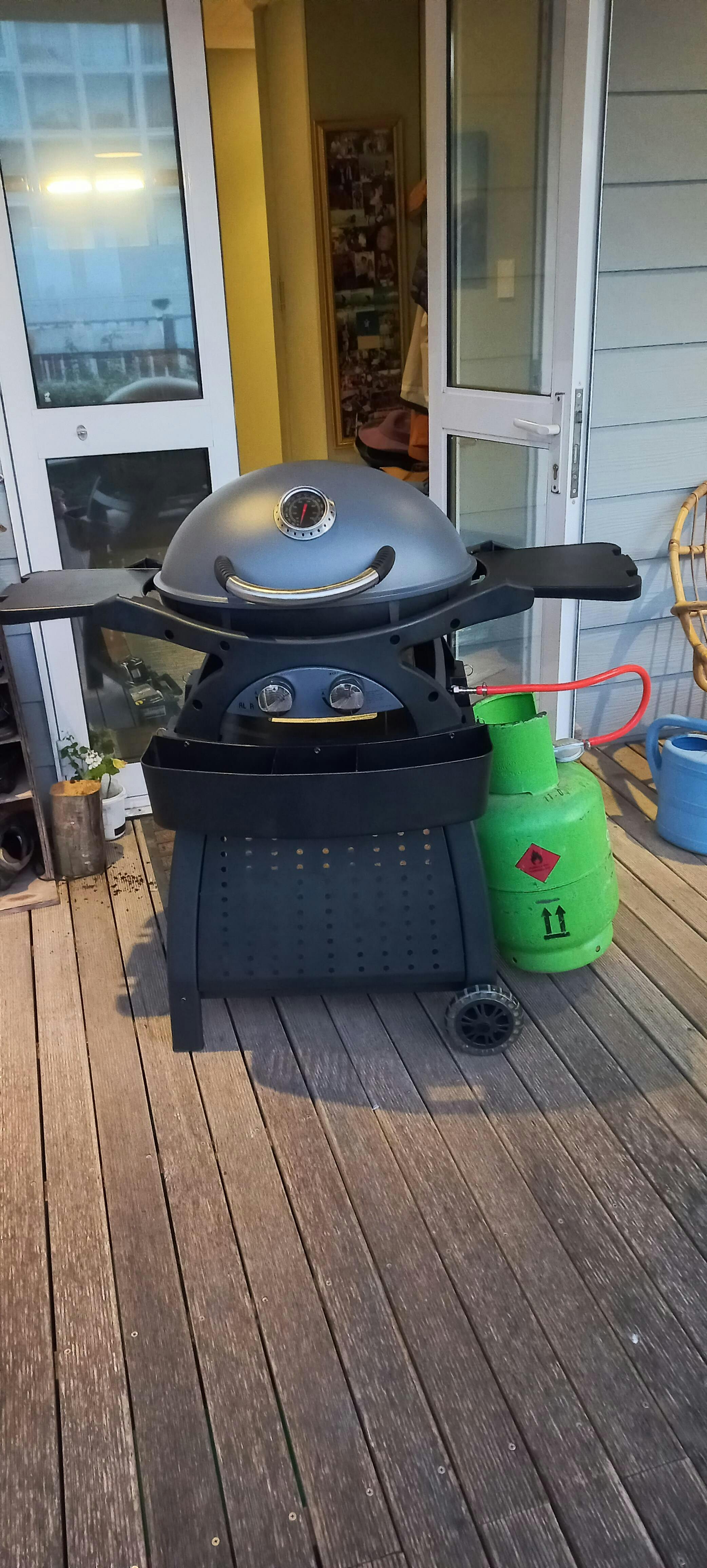 A compact 2-burner gas BBQ with a cart and a tabletop version, both are black. G651 ALVA - MONDO 2-BURNER GAS BBQ & CART